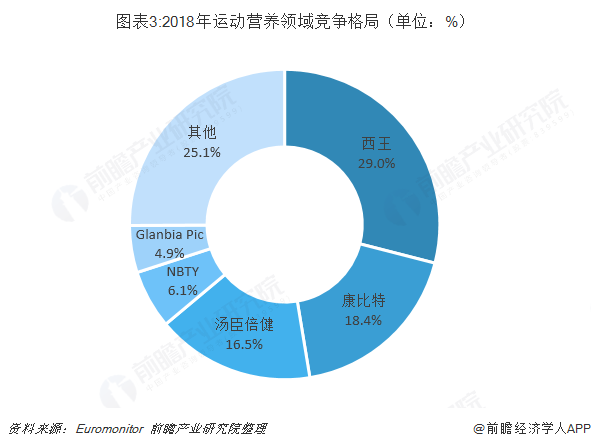 运动营养领域的保健食品主要针对健身和经常运动的人群,为其补充运动所需的各类营养如蛋白质等。市场规模较小但2015年以来保持30%以上的高增速,2016年西王食品并购获得知名运动营养品牌Muscletech,在2018年的运动营养市场中已占据较大的市占率优势,市场份额占比达到29.0%;其次是康比特,市场份额占比为18.4%。
