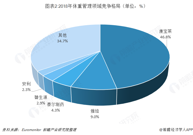体重管理领域的保健食品包括营养粉和混合饮料等代食产品,2018年国内市场规模达120亿元,从该市场的竞争格局来看,美国康宝莱在此领域占据绝对优势,控制近一半的市场份额,占比至46.8%;其余品牌的市场份额占比均在10%以下。