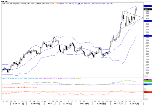 昨日黄金大涨18.9美元,上破前高1439美元,今早最高到达1450美元一线以上,非常强势。