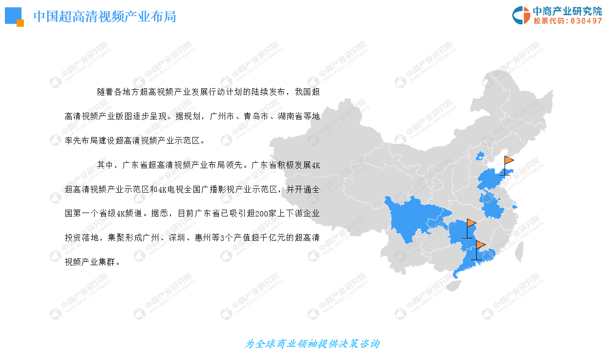 随着各地方超高视频产业发展行动计划的陆续发布,我国超高清视频产业版图逐步呈现。据规划,广州市、青岛市、湖南省等地率先布局建设超高清视频产业示范区。