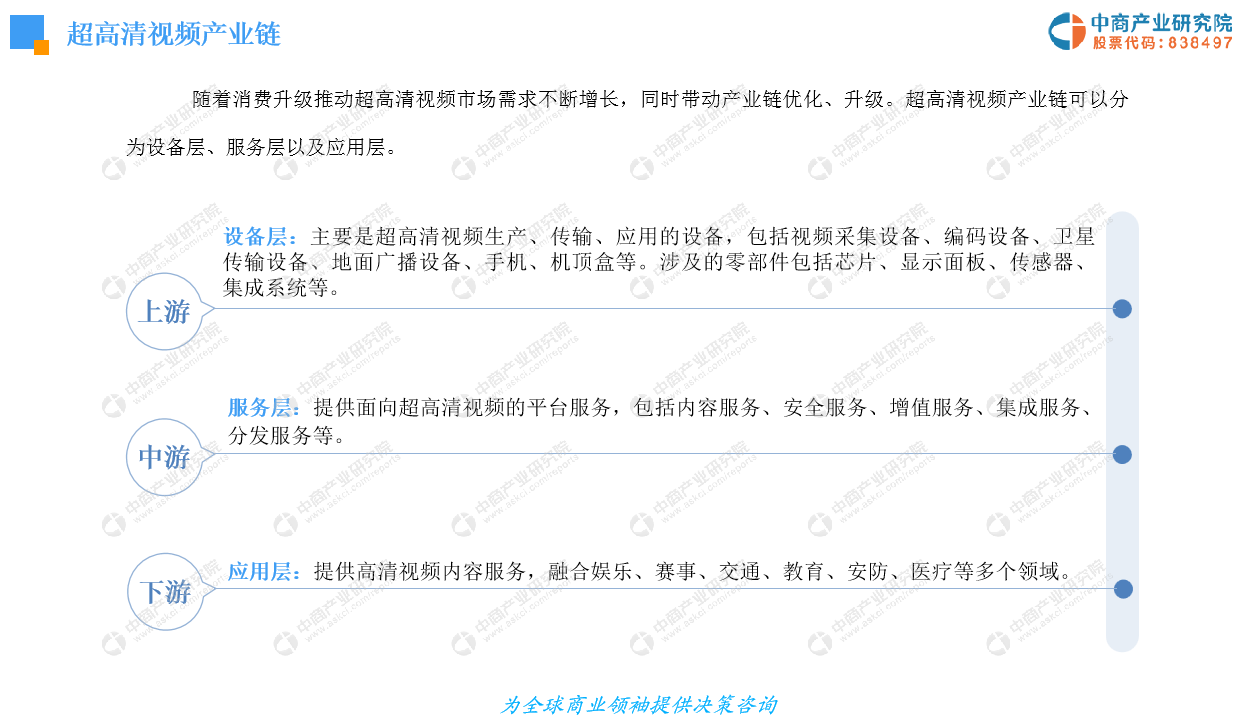 随着消费升级推动超高清视频市场需求不断增长,同时带动产业链优化、升级。超高清视频产业链可以分为设备层、服务层以及应用层。报告内附超高清视频产业链全景图及产业链企业布局情况。