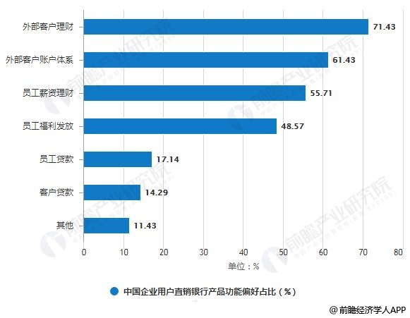 对于直销银行提供的线上金融产品,供应链企业贷款(51.43%)是企业用户最主要的需求点,直销银行可根据供应链平台所汇集的商流、物流、信息流、资金流等,对上下游信息进行深度挖掘,为供应链企业提供融资服务,拓宽其融资渠道。其次是公司理财(27.14%),企业线上理财需求将随着企业互联网化步伐的加快而攀升。