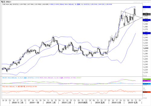 7月31日美国议息会议降息几无悬念,但降息落实之前现在黄金的涨跌取决于降息25个基点和50个基点的预期变动状况,可以看出上周金价是随着美联储官员讲话影响降息幅度预期的变化而变化。但无论幅度预期如何,预料在降息落地前黄金可以维持在1400美元上方。技术图上,黄金日线出现了顶背离,建议多头撤离,暂时观望,但在降息落实前暂不做空。