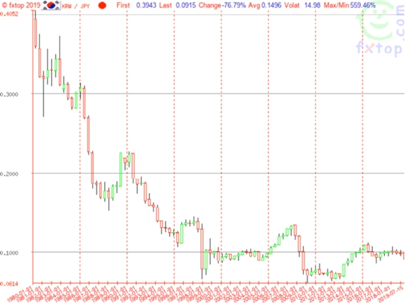 下面这张图是从1980年到2019年韩元兑日元的汇率变化图。