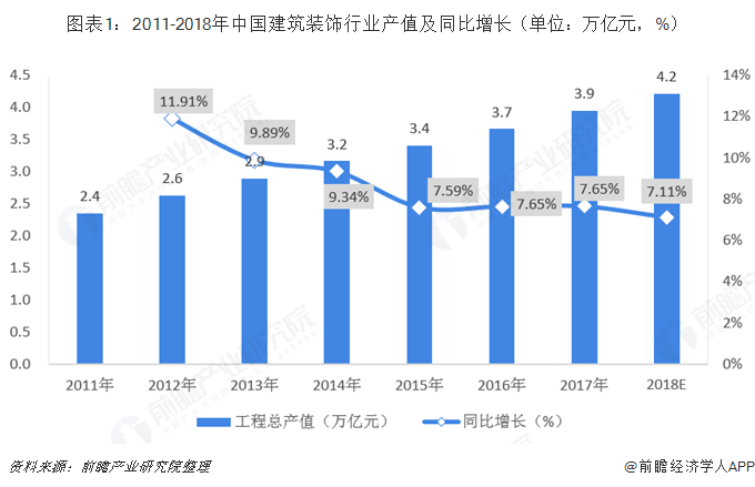 随着政府投资力度的加大和广大居民生活水平的提高,建筑装饰行业迎来了快速发展期。就近年来的产值增速走势来说,住宅装饰装修行业受到宏观环境和政府政策的影响较为明显。
