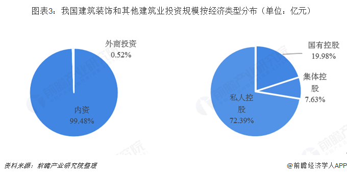 按经济类型来看,建筑装饰行业固定资产投资规模中,内资建筑装饰企业占据着绝大部分的份额。从内资属性来看,私人控股企业的投资份额占据绝大部分份额,其次是国有控股。