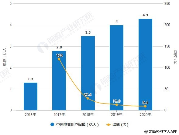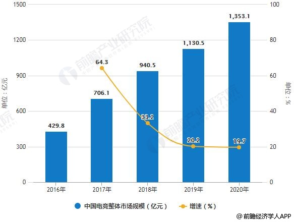 根据艾瑞咨询报告数据显示,预测到2020年中国电竞用户规模将达到4.3亿,中国电竞整体市场规模将达到1353亿元。