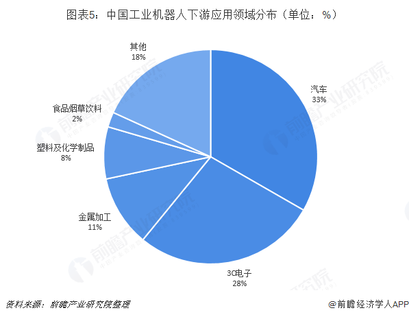 据2017年工业机器人销量数据显示,汽车行业仍是中国工业机器人应用最广泛的领域,占比达到33.25%;随后是3C、金属加工、塑料及化学制品、食品烟草饮料,占比分别约27.65%、10.76%、7.65%、2.27%。