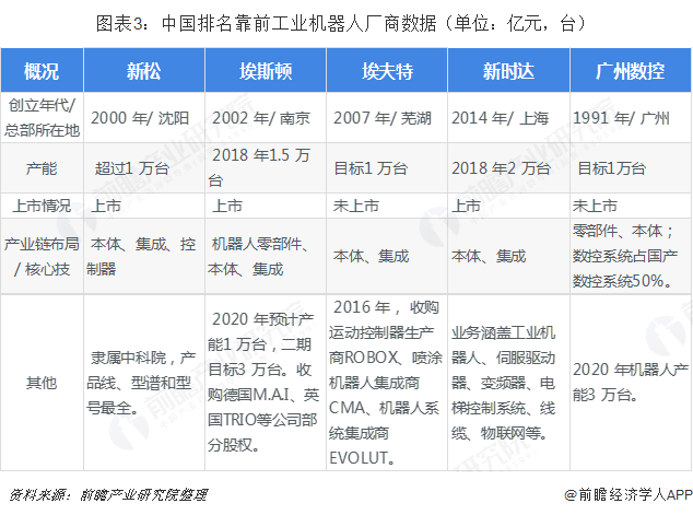 业界比较公认的中国工业机器人企业中较强的:沈阳新松机器人自动化股份有限公司(以下简称新松)、南京埃斯顿自动化股份有限公司(以下简称埃斯顿)、埃夫特智能装备股份有限公司(以下简称埃夫特)、上海新时达电气股份有限公司(以下简称新时达)、广州数控设备有限公司(以下简称广州数控)的相关数据列示如下。