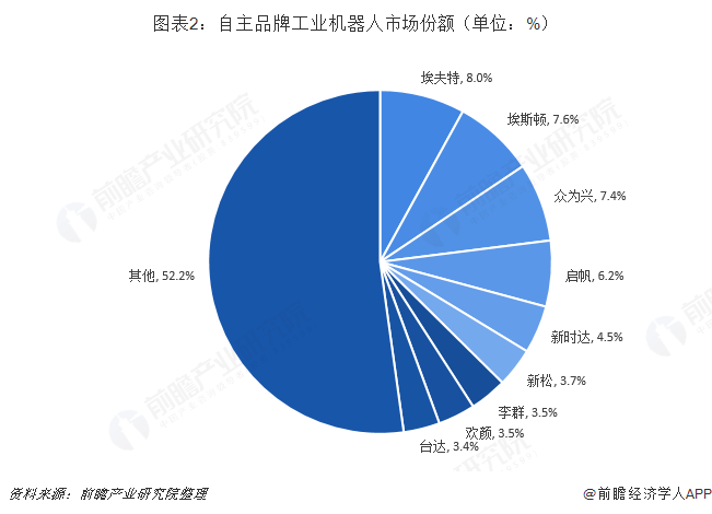 由于我国机器人市场仍然以外资品牌为主,国产工业机器人产业比较薄弱,面临国内如此巨大的工业机器人市场潜力,却没有一个国内企业参与市场中,分享市场规模不断扩张带来的红利。对比不同国内厂商的销售情况,市场表现较好的国内厂商分别是埃夫特、埃斯顿、众为兴、广州启帆、新松和新时达,相较其他本土厂商,这厂商起步较早,目前都已具备一定规模和技术实力。
