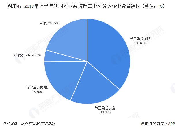 企业数量超过50家的共有23个省市、其中100家以上的有18个、200家以上的10个(河南、辽宁晋级200家俱乐部)。分地区来看,长三角经济圈机器人企业数量达到2478家,占机器人企业数量的比重达到36.43%。