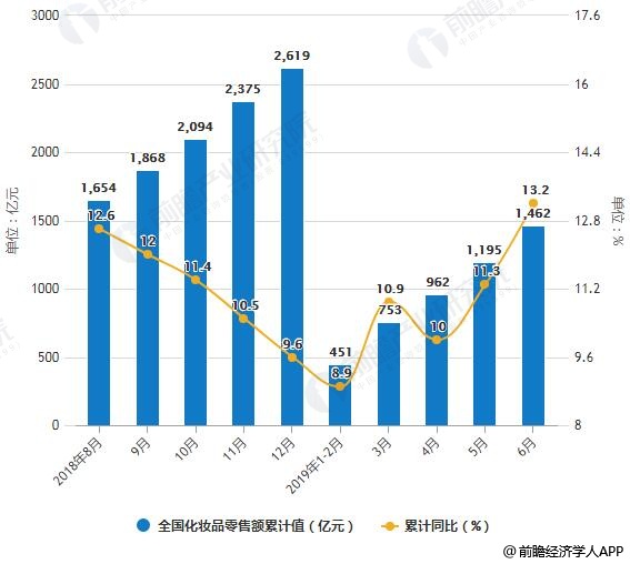 2018-2019年6月全国化妆品零售额统计及增长情况