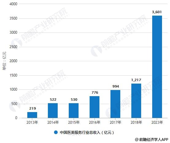 咨询公司Frost & Sullivan报告显示,2018年中国医美服务行业总收入达1217亿元人民币,预计2023年将达到3601亿元。
