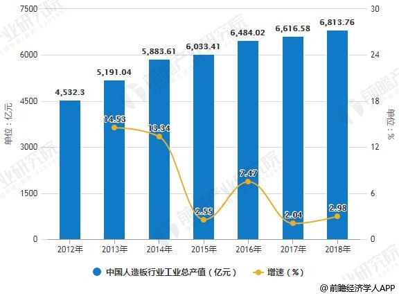 据前瞻产业研究院发布的《中国人造板制造行业发展前景预测与投资战略规划分析报告》统计数据显示,2012-2018年我国人造板制造行业工业总产值整体呈现上升趋势,2012年中国人造板行业工业总产值已达4532.3亿元,2015年中国人造板行业工业总产值突破6000亿元,到了2017年中国人造板行业工业总产值增长至6616.58亿元,同比增长2.04%。截止至2018年我国人造板产量同比增长4.43%,达到2.99亿立方米,同比增长2.98%,林业第二产业总产值增长3.07%,前瞻据此测算,2018年我国人造板行业工业总产值约为6813.76亿元,同比增长2.98%。