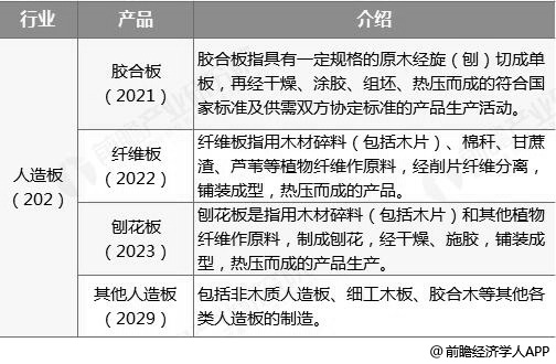 根据《国民经济行业分类》(GB/T4754-2017),人造板行业属于20大类“木材加工和木、竹、藤、棕、草制品业”、202中类“人造板制造”,包含胶合板、纤维板、刨花板三种主要产品以及其他人造板(如细工木板)。