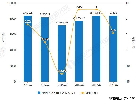 根据国家统计局数据显示,2013-2018年,我国木材产量呈现下降后上升的波动态势。2013年我国木材产量为8438.5万立方米,2014、2015年受国家环保绿化政策的影响,限制森林资源的采伐利用,加大了对天然林的保护,木材的产量急剧下降,2015年下降至7200.29万立方米。2016年开始,我国虽然对自然林保护加深,但是经济林、人造林等发展较为良好,带动了我国木材产量的增长,2017年我国木材产量恢复至8398.17万立方米。2018年,我国木材产量8432万立方米,小幅增长0.40%。