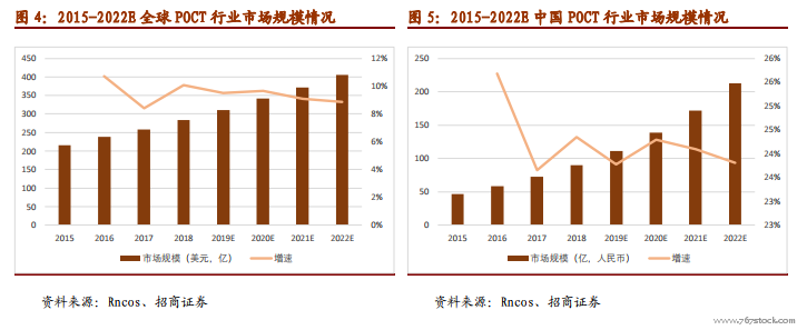 体外诊断行业是医疗器械行业中发展最快的子行业,POCT 领域是目前体外诊断中增速最快的细分子领域之一。国内 POCT 领域目前正处于行业周期中的快速发展阶段,2018年市场规模约为 80 亿元,预计到 2022 年行业规模将达到约 200 亿元,年均复合增长率接近 25%。POCT 在海外市场发展已较为成熟,2018 年全球市场规模约为 280 亿美元,预计 2022年超过 400 亿美元,年均复合增长率约 10%。相比海外市场,我国 POCT 领域虽然起步较晚,但近年来始终保持 20%-30%的快速增长,在全球处于领先水平,且待开发空间仍然十分广阔,预计未来 5-10 年内,国内 POCT 领域仍将继续维持 20%以上的较高增速。