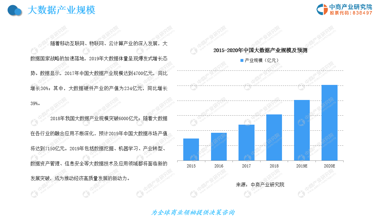 大数据产业是对数量巨大、来源分散、格式多样的数据进行采集、存储和关联分析,从中发现新知识、创造新价值、提升新能力的新一代信息技术和服务业态。随着大数据在各行业的融合应用不断深化,预计2019年中国大数据市场产值将达到7150亿元。