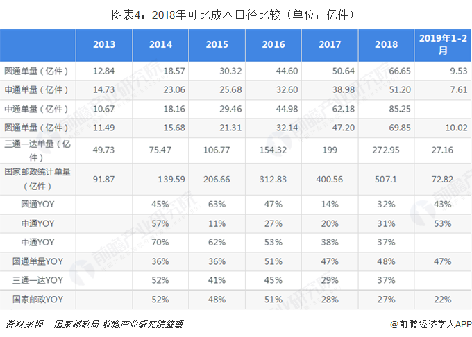 从三通一达单量看快递单量仍然保持较快增速。2018年圆通(32%)、申通(31%)、中通(37%)、韵达(38%)四家的合计单量增速为37%,高于国家邮政局统计的快递单量总体增速27%。2019年1-2月,圆通(43%)、申通(53%)和韵达(47%)的增速也高于国家邮政局统计的快递单量总体增速22%。