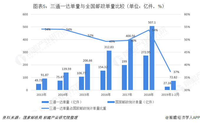 而三通一达单量占国家邮政统计单量比重来看,经历了从减少再增长的局面,2018年三通一达占比达到了2018年的高点。(2019年数据不包含中通)。