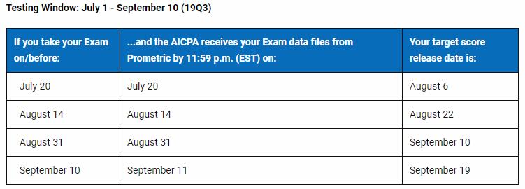 每季度AICPA考试一般有四次的公布时间,每次公布时间间隔长短不一,2019年Q3季度AICPA考试成绩公布如下: