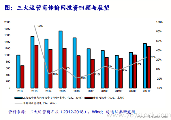 我们预计传输网投资2019年下降2%、2020年增长10%。2013年,传输承载网革新,由SDH/MSTP向IPRAN/PTN方向演进,当年传输网投资增速高达92%。2019年光网络投资规划受无线网络投资增长挤压和宽带接入投资下滑影响,略有下滑(预计994亿元),其中传输网预计投资908亿元(-2%);我们预计将于2020年再次迎来增长(预计1003亿元,+10%)。我们预计传输网占光网络投资比例,2018-2020年分别为81.7%、91.3%、92.8%。