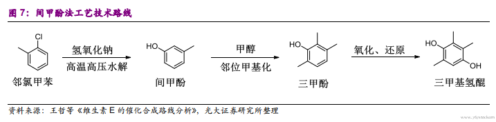 间甲酚法工艺最为广泛,是目前三甲基氢醌主要合成路线。工艺路线为间甲酚与甲醇在催化剂作用下选择性发生邻位甲基化,生成 2, 3, 6-三甲基苯酚,氧化后氢气还原得到三甲基氢醌。该工艺具有流程短,产品收率较高,污染小等优点。原料间甲酚可由煤焦油提取,但受制于煤焦油中含量,数量有限,大部分间甲酚通过合成所得,合成方法有邻氯甲苯水解法、邻二甲苯氧化法等,主流工艺为邻氯甲苯水解法,即邻氯甲苯在过量的氢氧化钠高温高压下水解得到,工艺难点在于水解需要高温高压,并伴随较大量的副产品二甲基羟基联苯和二甲基联苯醚生成,需要连续化反应来抑制副反应。
