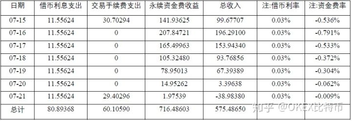 2019-07-15至2019-07-21,永续资金费总收益扣除借币利息总支出和交易手续费总支出,得出7日资金费率套利纯收益575.4865 TRX(若借币利率没有打折,纯收益约为386.73 TRX),7日回报约1.66%(按照1000 USDT等值资本金计算)。