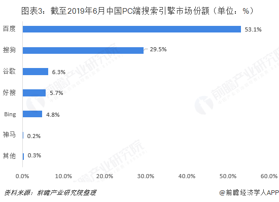 从PC端来看,百度的市场份额近两年内都呈现下降趋势,2019年6月下降至53.1%,但还是领先于搜狗依托自身游览器捆绑式的搜索模式,2018年市场份额为29.5%。而国外的搜索公司谷歌、Bing市场份额虽有所增长,但PC端占比仍然很小。