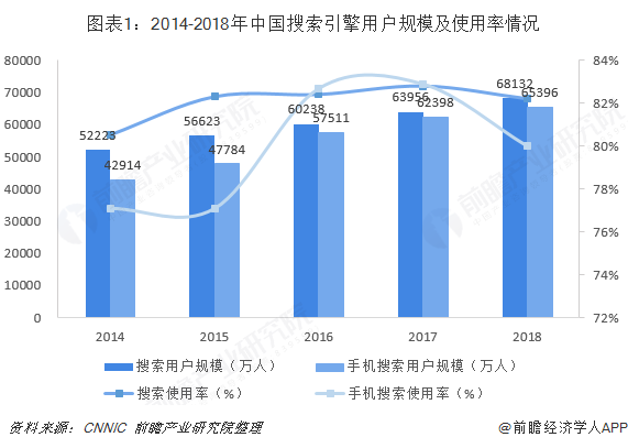 据中国互联网信息中心(CNNIC)数据显示,截至2018年12月,我国搜索引擎用户规模达6.81亿,使用率为82.2%,用户规模较2017年底増加4176万,増长率为6.5%。手机搜素用户规模达6.54亿,使用率为80.0%,用户规模较2017年底增加2998万,増长率为4.8%。