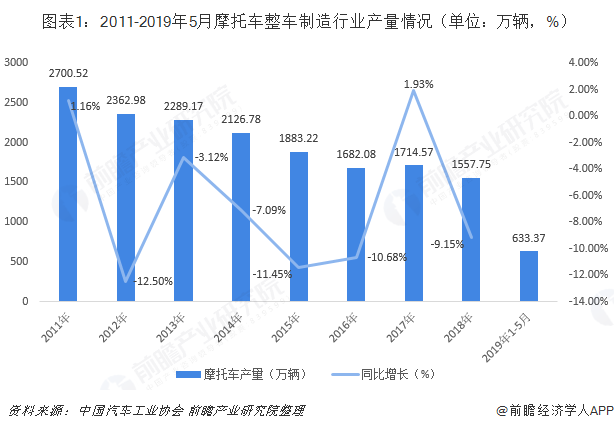 2018年我国摩托车工业面对严峻复杂的国内外形势,以及更加严格的环保措施,行业产销总体表现较为低迷。据中国汽车工业协会摩托车分会统计数据显示,2018年,全行业摩托车产量为1557.75万辆,较2017年下降9.15%。2019年1-5月,全行业累计产量摩托车633.37万辆,同比下降5.13%。