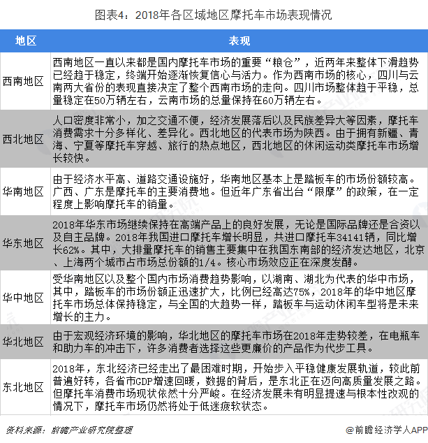 2018年国内摩托车市场处于下行时期,内生动力不足,企业也缺乏足够数量的新品推出,导致各主要区域市场消费热情不够,市场表现欠佳。同时,由于区域经济本身基础与发展方向的差异,以及整个摩托车市场本身的转向,让不同的区域也呈现出很大的差别。