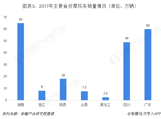 根据《2018中国摩托车白皮书》显示,2017年国内摩托车市场的复苏,得益于国内经济的强势增长,居民购买力持续增强。而市场向好的背后,也显示出当前的中国摩托车行业正在经历由“量”到“质”的转变:一方面是低端产品、通路产品市场的下滑,另一方面是高品质产品、休闲运动市场的提升。但2018年产量和销量的下滑,对摩托车产业而言,挑战巨大。从2017年主要区域的销售量来看,由于区域经济发展存在差异,以至于销量相差较大。2017年湖南省的销量达65万辆,同比增长3.17%,而黑龙江的销售为2.5万辆。