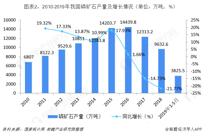 2010-2015年,我国磷矿石企业数量不断扩增,产能快速增长,磷矿石产量从6807万吨增长至14203.7万吨,年复合增长率达到15.85%。随着资源开采,磷矿石资源日趋枯竭,因此中国于2016年将磷矿石纳入我国战略性矿产目录,国内出台了环保限采、征收资源税等政策,限制磷矿资源的过度开采。同时,我国从2016年开始了全国持续的环境审查工作,尤其加大了对长江流域排污企业的集中整治。在生态环保规划和磷矿行业治理的双重政策下,我国磷矿产量从2016年开始下滑,落后产能持续淘汰。2017年我国磷矿产量开始同比下跌,去产能管理获得初步成效;2018年我国磷矿产量为9632.6万吨,近年来首次跌落1亿吨,同比下滑21.77%。