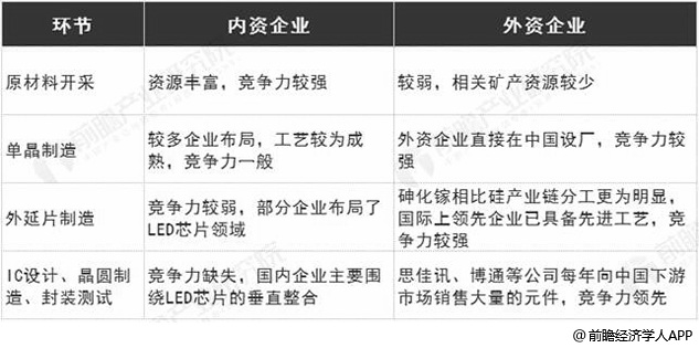 从国内大陆地区来看,我国砷化镓行业产业链中,我国原材料较为丰富,具备较大竞争力;单晶制造环节已有较多企业布局,工艺较为成熟,主要满足国内需求,竞争力一般,直接面临国际领先企业在华工厂的竞争,比如美国AXT公司在中国布局了工厂;外延片制造环节中国大陆地区几乎空白,部分上市企业布局了LED芯片的制造,较为低端;IC设计、晶圆制造、封装测试等环节也主要围绕LED芯片的垂直整合,通讯元件方面的布局才刚起步,竞争力缺失。