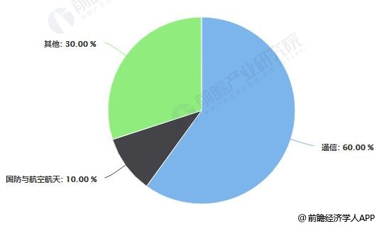 就目前的技术趋势以及技术发展水平来看,目前,砷化镓从大类方向来看主要于通信领域和国防与航空航天领域,其占比分别达到60%、10%。