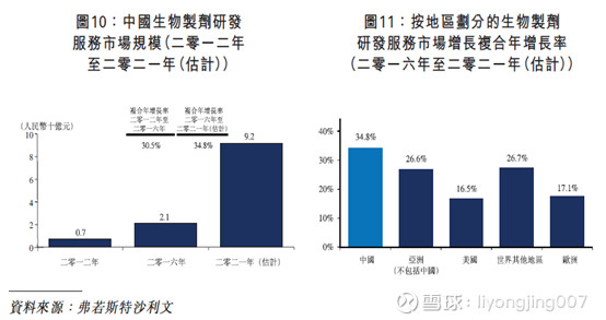 根据弗洛斯特沙利文的数据,中国生物制剂研发服务市场规模将从2016年的21亿元增长至2021年的92亿元,行业年化增速为34.8%。按地区划分的话中国将是世界上增速最快的地区。药明生物目前收入占比最大的美国地区的增速为16.5%,收入占比第三大的欧洲地区的收入占比为17.1%。