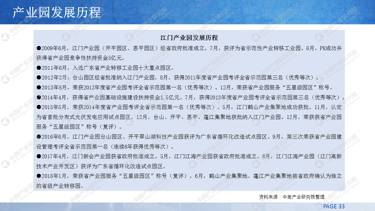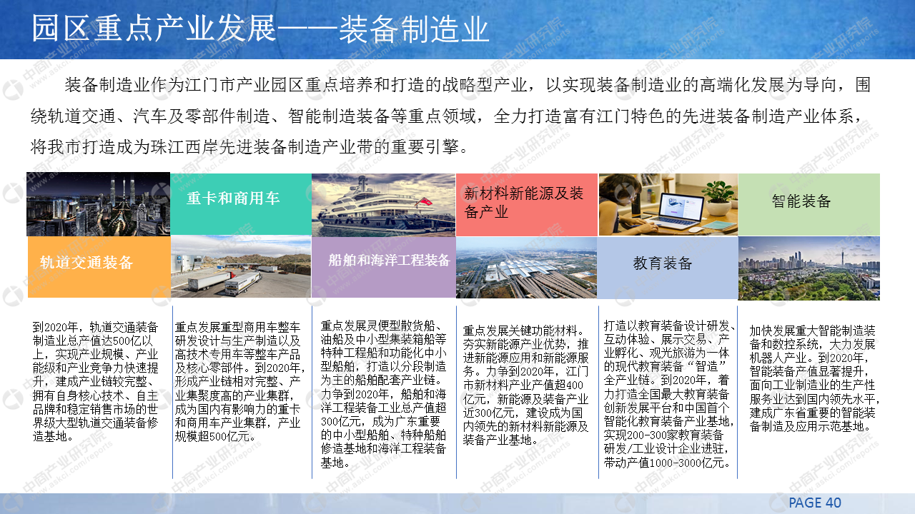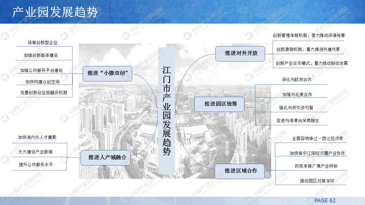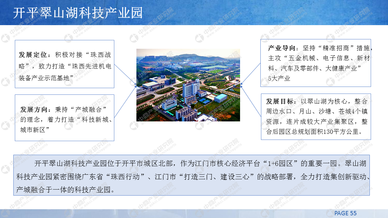 本报告重点介绍了江门滨江新城、江门国家高新区、新会银洲湖、台山工业新城、开平翠山湖科技产业园、鹤山工业城及恩平工业园等1+6重点产业园。