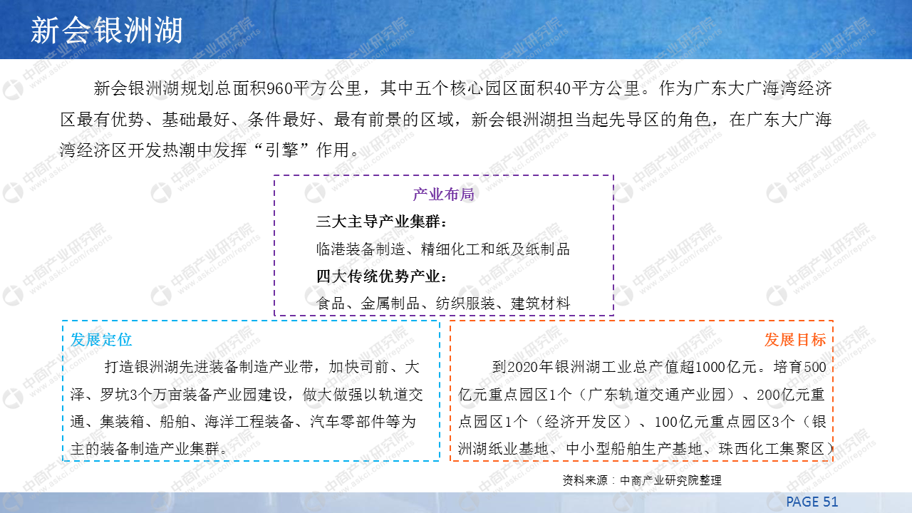 新会银洲湖规划总面积960平方公里,其中五个核心园区面积40平方公里。作为广东大广海湾经济区最有优势、基础最好、条件最好、最有前景的区域,新会银洲湖担当起先导区的角色,在广东大广海湾经济区开发热潮中发挥“引擎”作用。
