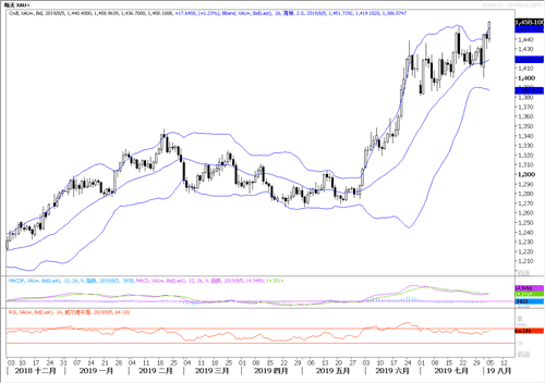 因为贸易紧张、人民币破7引发了避险资金涌入金市,黄金大涨,周一早上上破1450美元,后市有望继续走高,前期空头须全部离场。