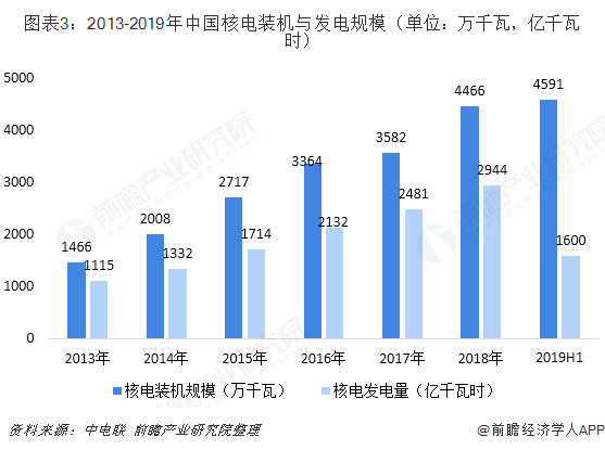 虽然近年来受国家核电批复减少以及新建投资额的降低的影响,我国核电主要企业电源项目在建规模有所缩小,但是随着项目的完工,我国核电装机规模不断扩大,发电量同步提高。根据中电联数据显示,2018年我国核电装机量达到4466万千瓦,发电量2944亿千瓦时;及至2019年上半年,核电装机规模以达到了4591万千瓦时,发电量1600亿千瓦时,同比均有明显提高。