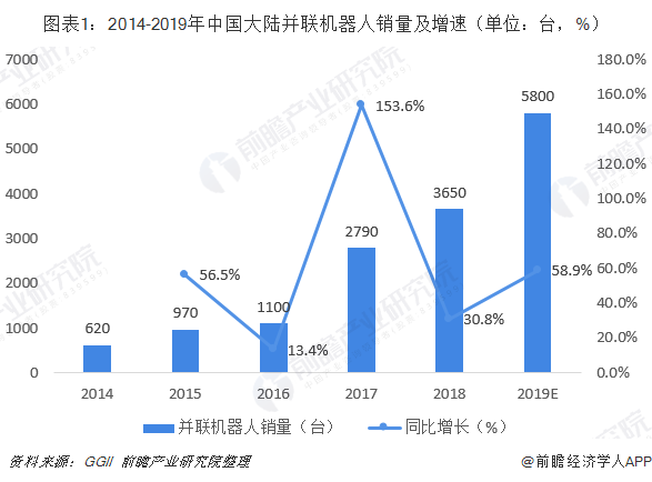 据GGII数据统计,以中国大陆的市场为例,2014年并联市场销售约为620台,2015年销售约为970台,2016年销售约为1100台,2017年销售约为2790台,2018年销售约为3650台,年均以50%的增速发展,因此初步预计2019年并联机器人市场约为5800台,机器人并联市场正当其时。