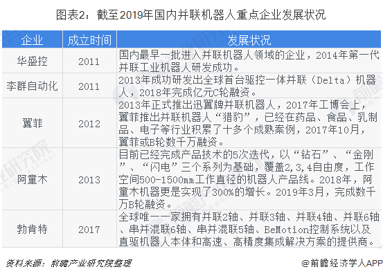 作为工业机器人的分支行业,并联机器人市场规模较小,专注并联机器人的生产企业数量较少。我国并联机器人行业于20世纪90年代初期开始发展,经过技术与经验的不断进步与积累,行业中涌现出一批竞争实力较强的国产企业,主要有翼菲自动化、勃肯特、李群自动化、华盛控、阿童木等。