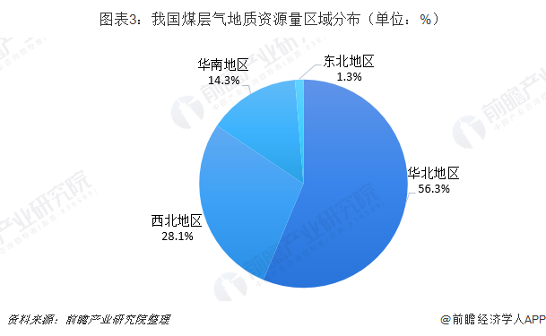 我国煤层气的储量相对集中。我国埋深2000米以内浅煤层气主要分布在华北和西北地区,其中华北地区、西北地区、华南地区和东北地区赋存的煤层气地质资源量分别占全国煤层气地质资源总量的56.3%、28.1%、14.3%、1.3%。