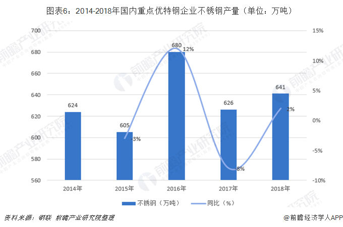 2014-2018年国内重点优特钢企业不锈钢产量呈现波动态势,在2016年达到阶段性高点680万吨,2018年为641万吨,较2017年增加2%。
