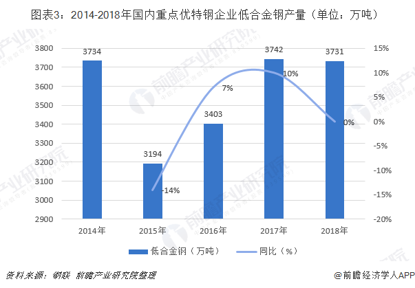 2014-2018年国内重点优特钢企业低合金钢产量整体呈现波动的态势,2015年下跌超过14%,随后又恢复了增长,到2018年国内重点优特钢企业低合金钢产量已经达到3731万吨,较2017年稍有下降。