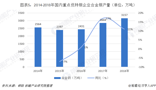 2014-2018年国内重点优特钢企业合金钢产量整体呈现上升趋势,而且2017-2018年呈现快速增长趋势,年增长率超过10%。2018年国内重点优特钢企业合金钢产量达到3157万吨,较2017年同比增加11%。
