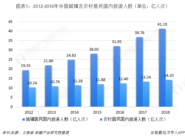 根据文旅部统计数据,2012-2018年我国国内旅游人数逐年攀升,2018年达到55.39亿人次,较2017年同期增长10.8%;其中,城镇居民41.19亿人次,增长12.0%;农村居民14.20亿人次,增长7.3%。