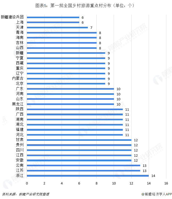 在重点村名单中,包括北京密云区古北口镇古北口村、广西桂林市灵川县大圩镇袁家村、湖南湘西土家族苗族自治州花垣县双龙镇十八洞村、安徽宣城市广德县太极洞风景区桃园村、河北保定市涞水县三坡镇百里峡村等知名旅游村均在此次发布的名单中,而乡村旅游起步较早的江浙地区、川渝地区均有不少乡村入选,浙江省乡村旅游重点村达14个,成为最大赢家;江苏、云南紧随其后,乡村旅游重点村达到13个。
