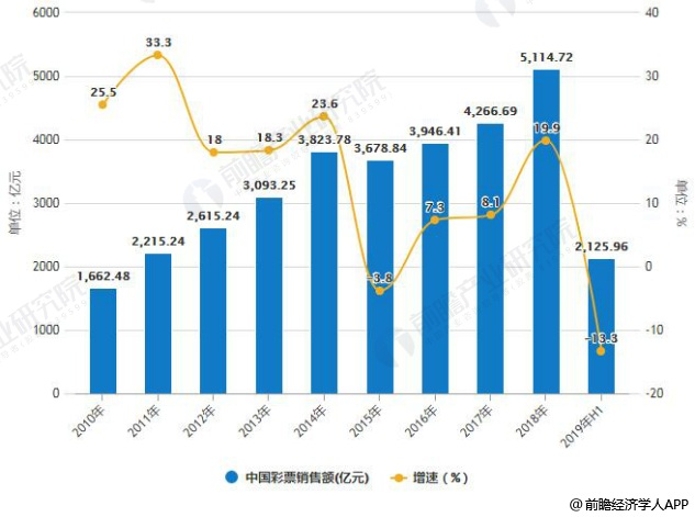 回顾这十年来的彩票市场,2010~2012年先经历了两位数的快速增长期,然后增幅逐步下降至个位数,在2019年上半年首次出现同比负增长。
